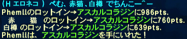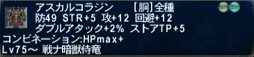 何だこの神性能w ケーニヒとかHNM装備とかリンバス装備を持ってない人間には嬉しい一品! HPと敵対心を同時に、しかもかなりの数値で上げられる装備って珍しいですよ。 はっきり言ってAF2のヴァラー頭&手よりこっちの方がいいです、個人的に。 まぁ、VITはかなり下がっちゃいますが… ナイトの一番の弱みである魔法防御が上がるのもいいなーと思うのです。 さっそく欲しくなったので、入手経路を調べてみたところ… 過去サンドリア部隊所属で、戦功水晶章以上の勲章所持者が、戦績40,000ポイントと交換とな。 バス所属なんですがー。がー。 涙を飲んで、過去の故郷に別れを告げて、サンドに移籍しました。(´;ω;`) てっきり現在と同じように、戦績・ワープ・勲章リセットかと思いきや、 3国は「連合軍」として同盟を結んでいるおかげか、勲章2つ剥奪だけで済みました。 2つ程度じゃ戦功水晶章未満にはならないので、余裕でラム装備を(σ´Д`)σ うん、まぁ、思ったよりは変じゃなかった、ラム装備。 ワラーラよりはずっといいよね! むしろカッコイイかもしれん! 問題なのは脚か! 脚だな!! アダマンかアスカルしかないよ! そろそろAF2【ください】(´_ゝ`) HPブースト装備ですと、このラム装備のお陰で1700を越えました。 ただ、逆に防とVITがエライ下がるんですよねぇ。パラニン盾なら問題ないけど。 裏ではヴァラーとどっちを装備しようかなぁ。 対比。 HPブースト装備 -> HP1707 防377 VIT79 敵対心25 魔防+5 裏用装備AF2 -> HP1483 防404 VIT102 敵対心36 被ダメ-7% 被魔法ダメ+5% 裏用装備ラム -> HP1489 防402 VIT97 敵対心38 被ダメ-7% 被魔法ダメ+5% 魔防+5 うーん…タコス食事すればVITは100超えるし、ラムに変更でいいか。 次のVUで、脚にも優秀なラム装備が実装されることを期待します。 指ももうちょい考えたい…/(-_-)\ 剣もサングインソードが欲しいなぁ。オートクレールは無理だし。 踊り子AFに必要な素材がだいぶ値下がりしたので、やってきました。 夢を見ました。 サボってたナイズル島アサルト日記(/ω\) |